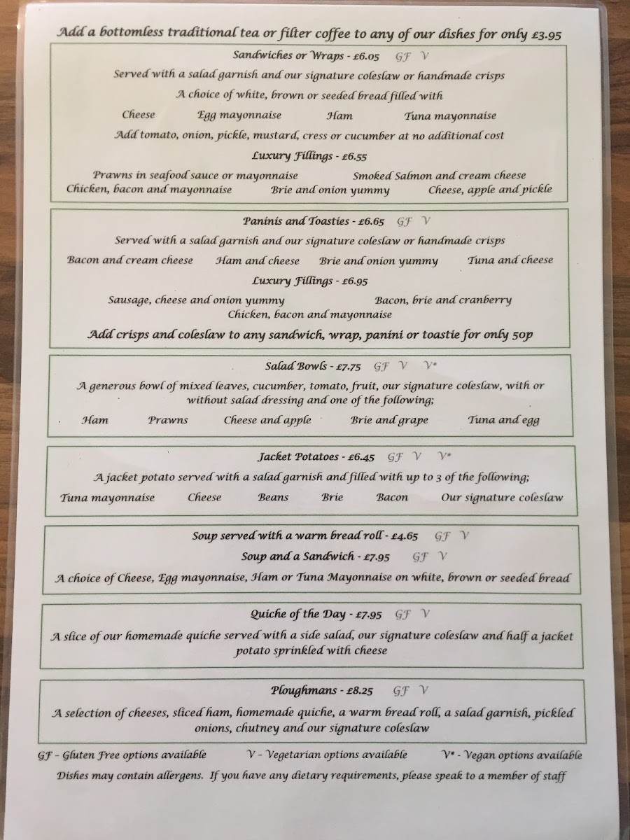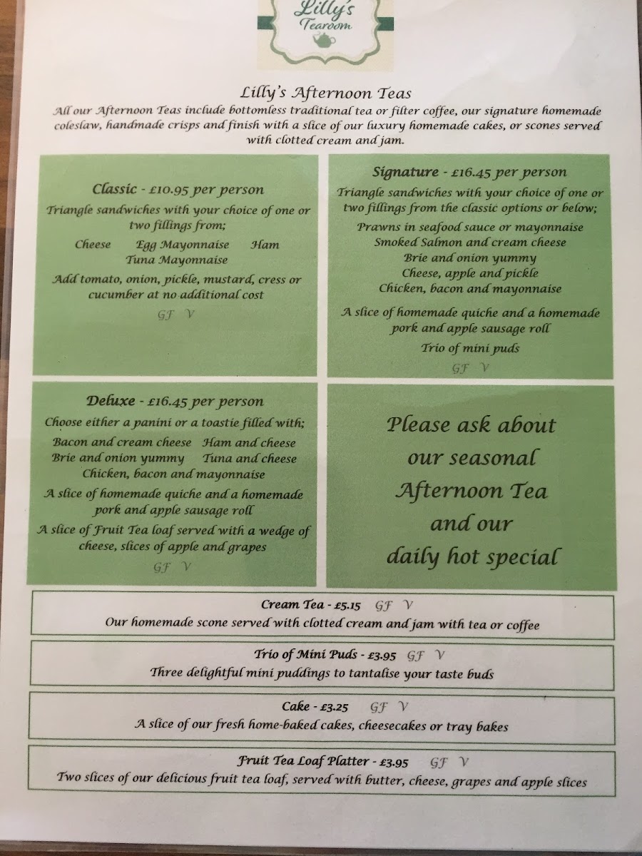 Lilly's Tea Room Ltd offers a delightful menu that combines traditional British comfort food with a touch of homey elegance. Among the standout options, the Ploughmans stands out as a quintessentially British choice, offering a perfect balance of flavors with cheese, bread, and pickles. For those seeking something lighter, the Tuna Salad provides a refreshing, healthy option, bursting with fresh ingredients. Dessert lovers will not be disappointed either, as the Carrot Cake is a must-try, perfectly spiced and moist, making it the ideal end to a meal. With its inviting atmosphere and diverse menu, Lilly's Tea Room ensures that each visit is an enjoyable culinary experience.